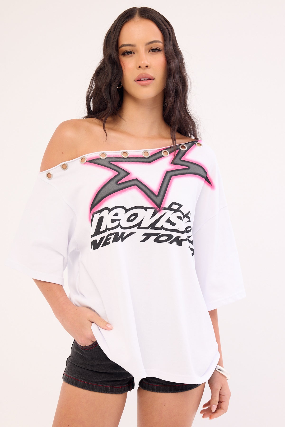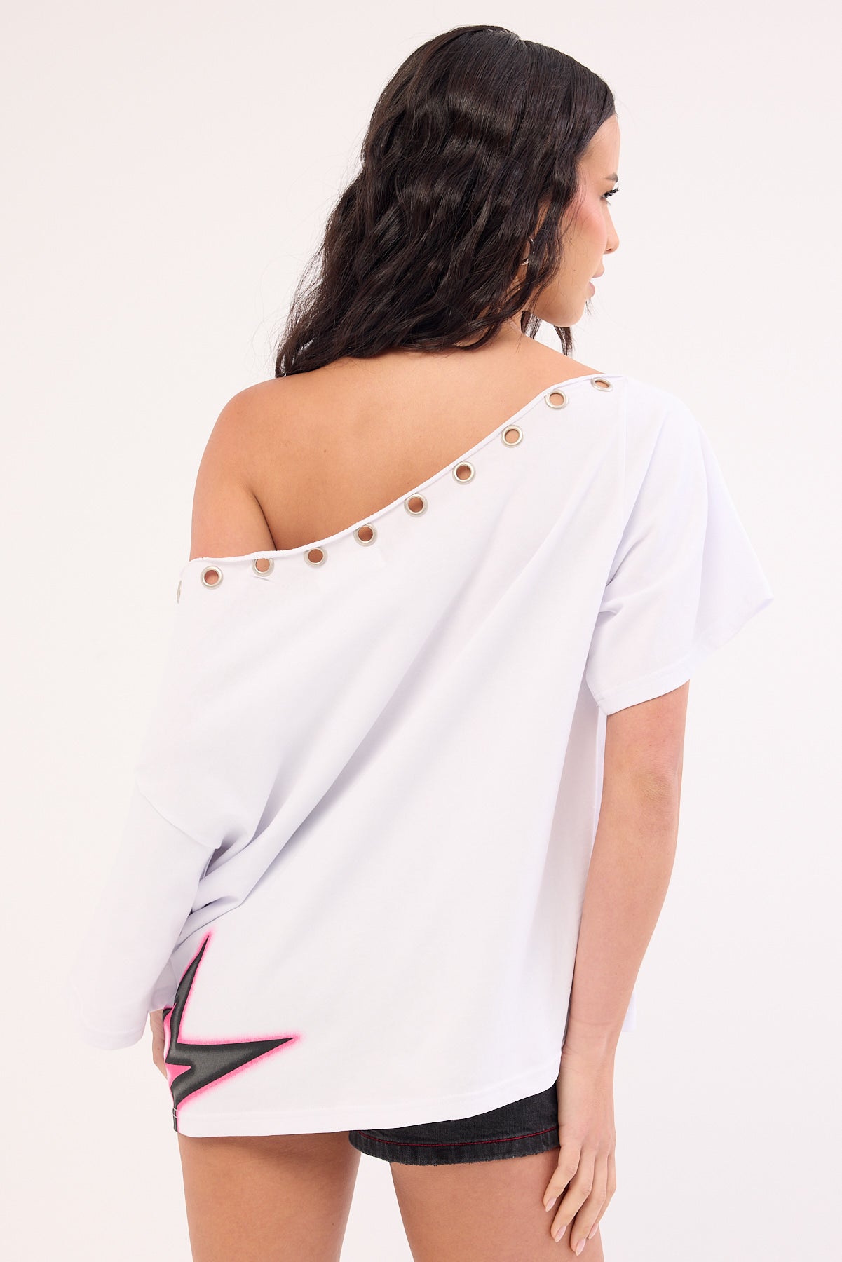 Cold Signal Off Shoulder Relaxed Tee White