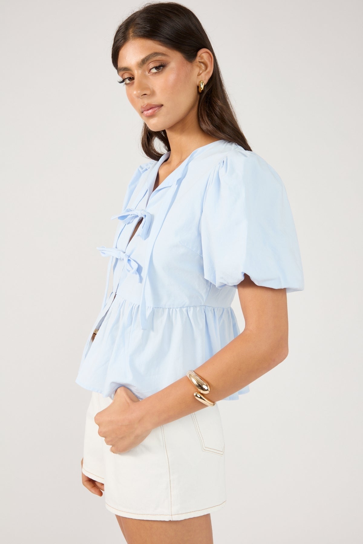 Ingrid Tie Front Short Sleeve Blouse Light Blue
