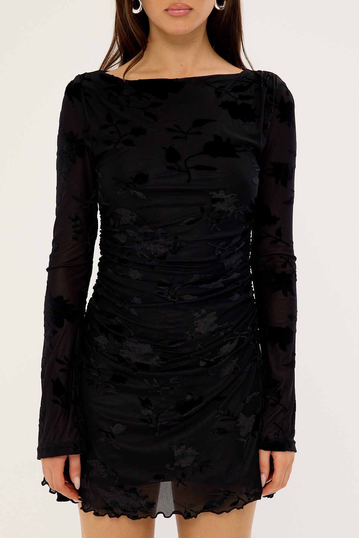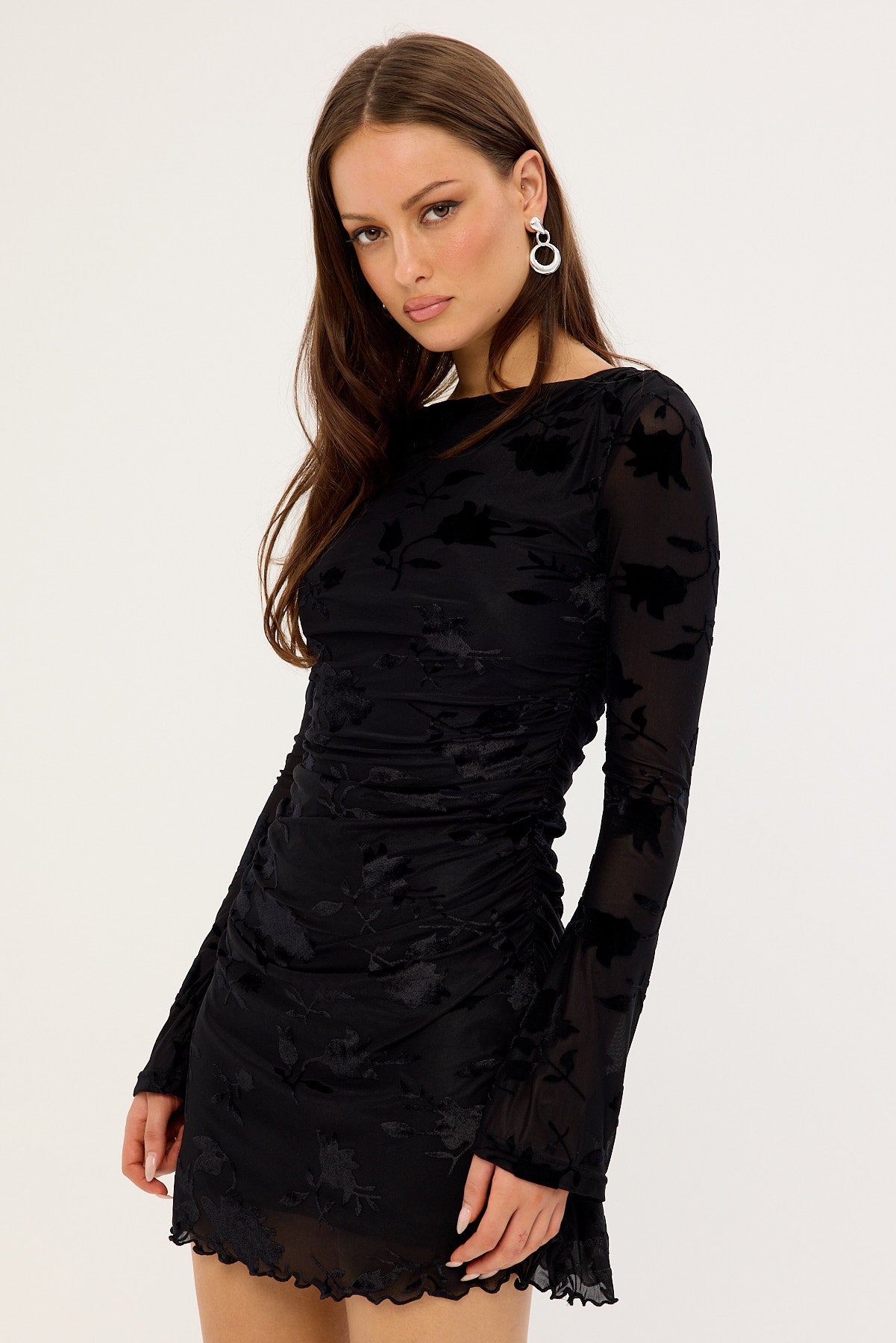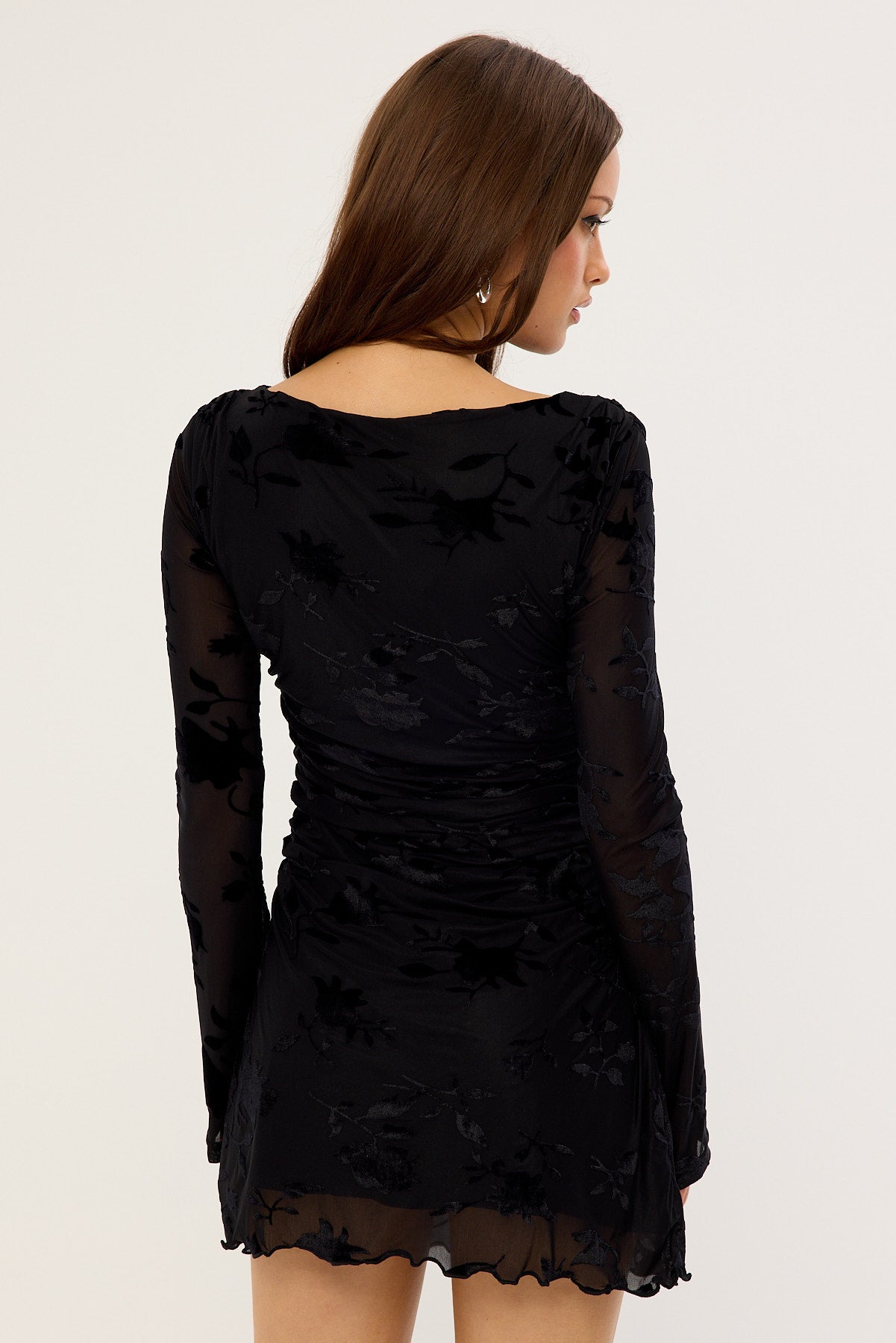 Ulla Flocked Long Sleeve Mini Dress Black