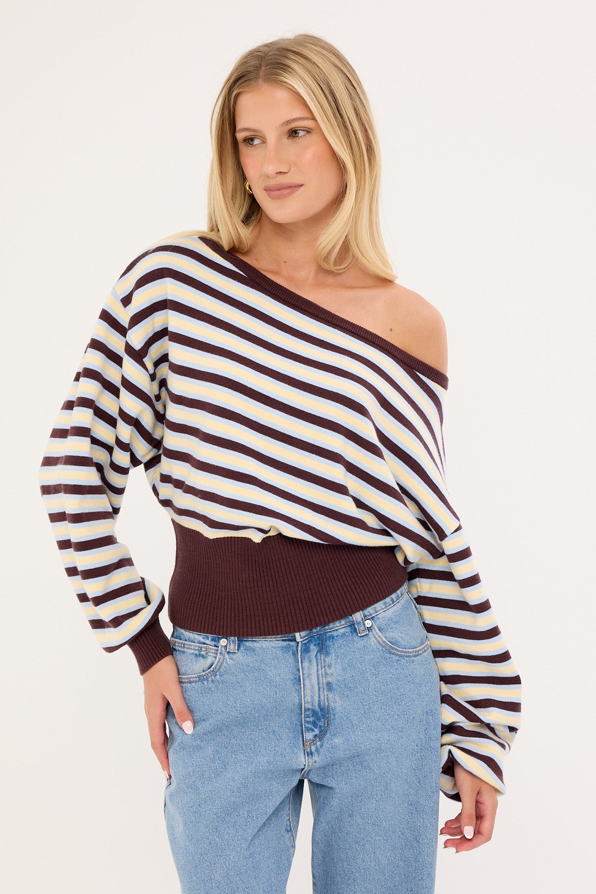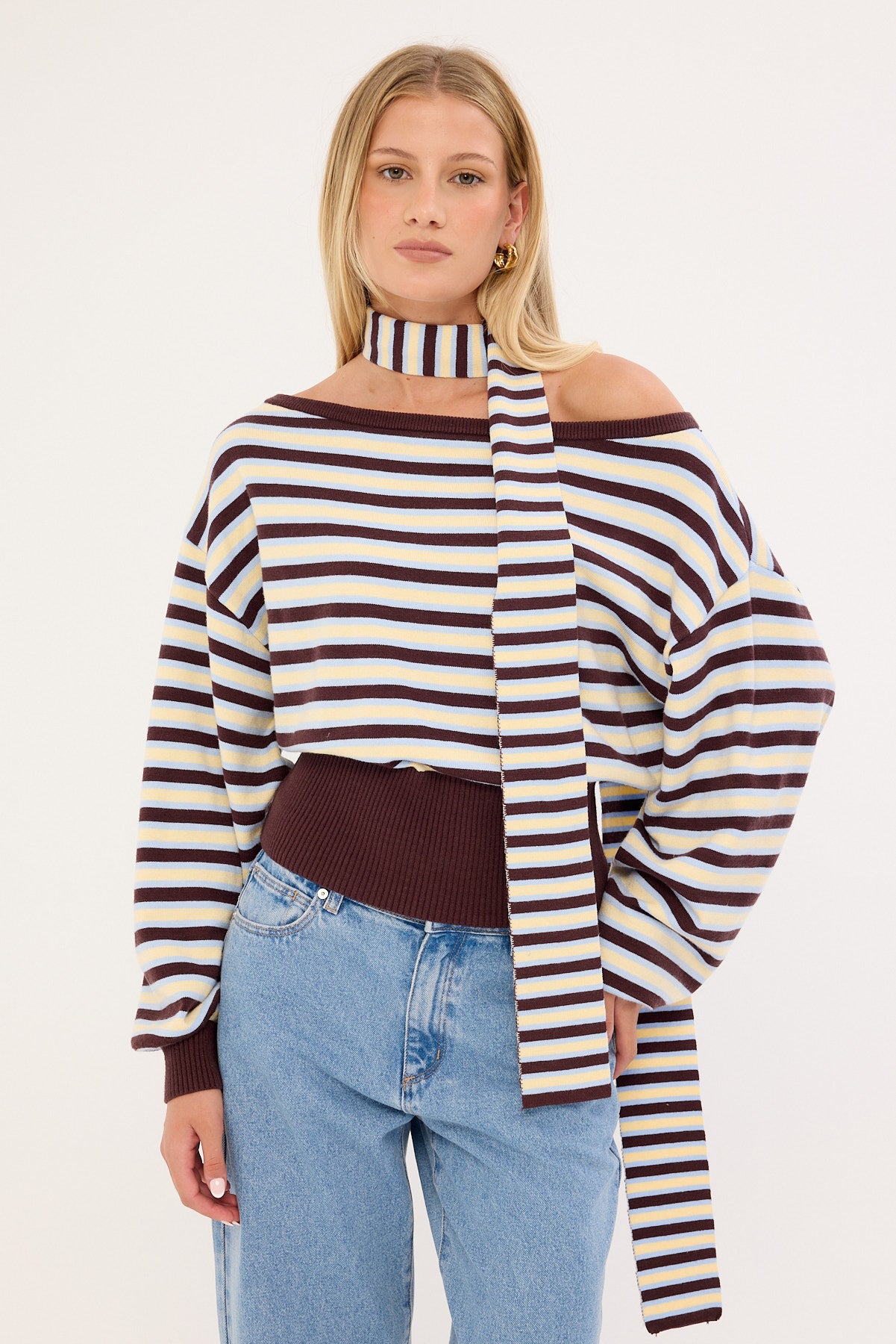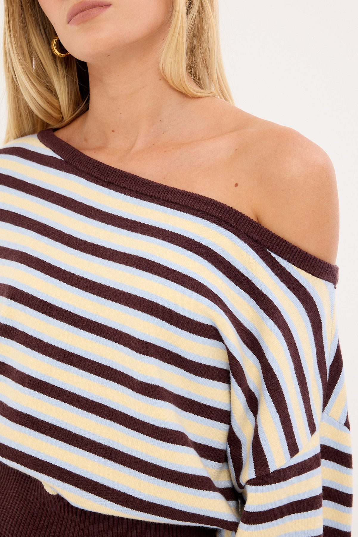 Blanca Stripe Off Shoulder Scarf Knit Brown Stripe
