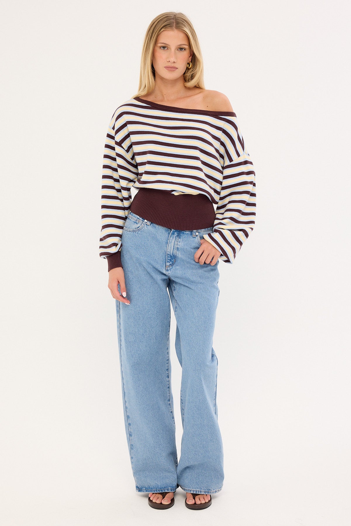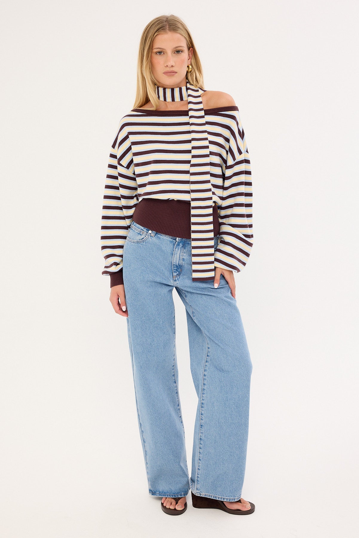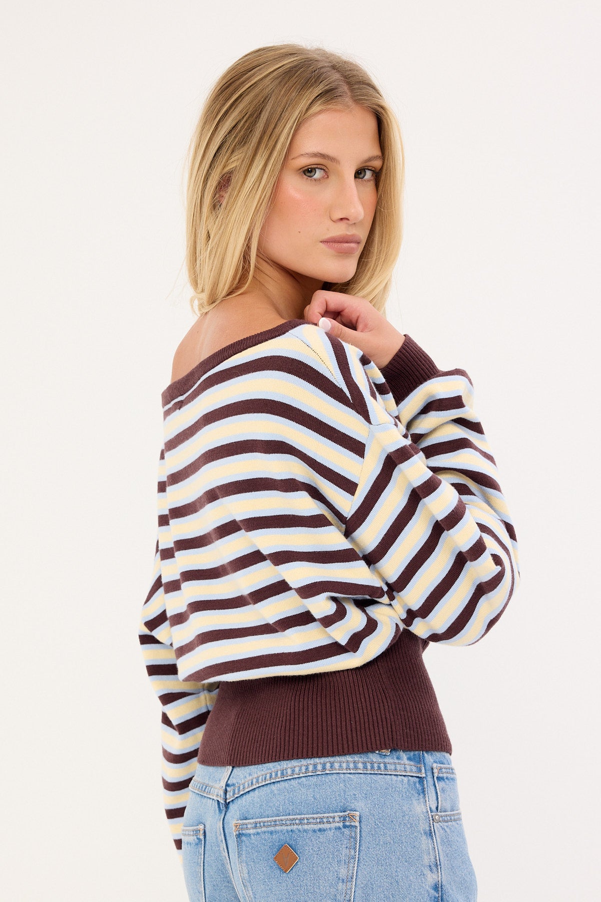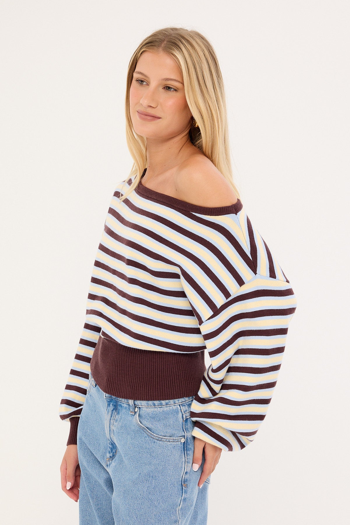 Blanca Stripe Off Shoulder Scarf Knit Brown Stripe