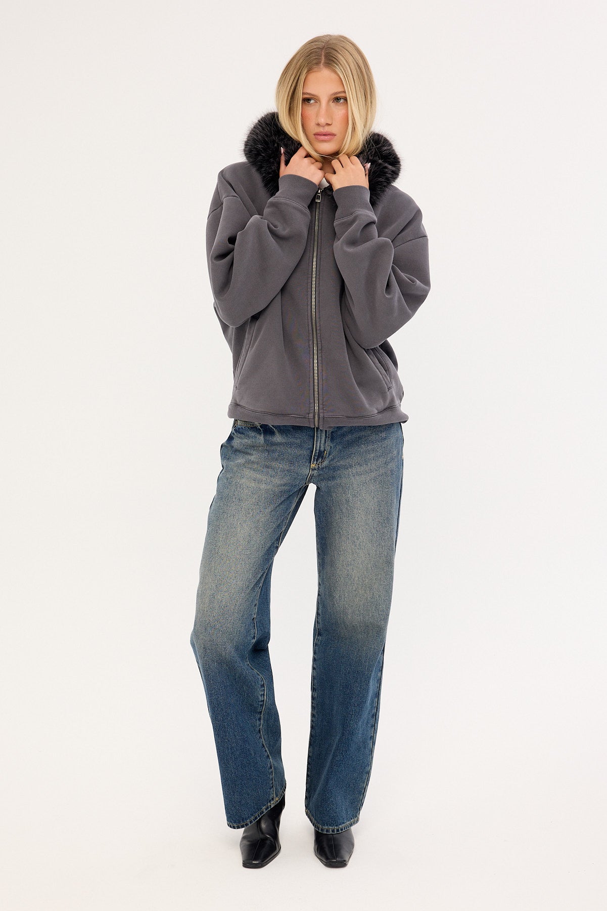 Frosted Faux Fur Zip Through Street Hoodie Washed Black