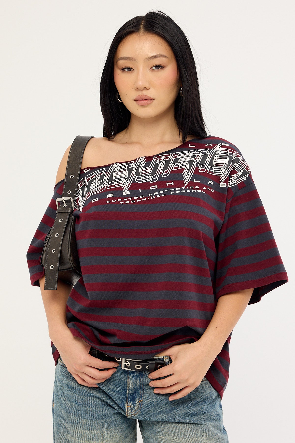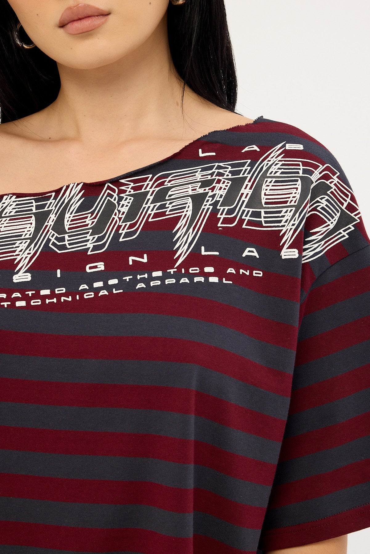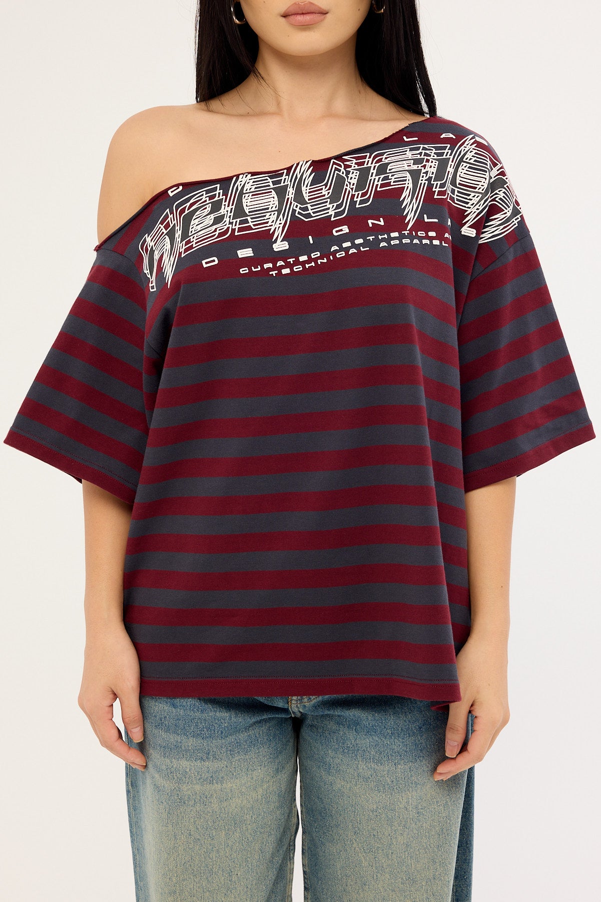 Corrupt Off Shoulder Relaxed Tee Burgundy Stripe