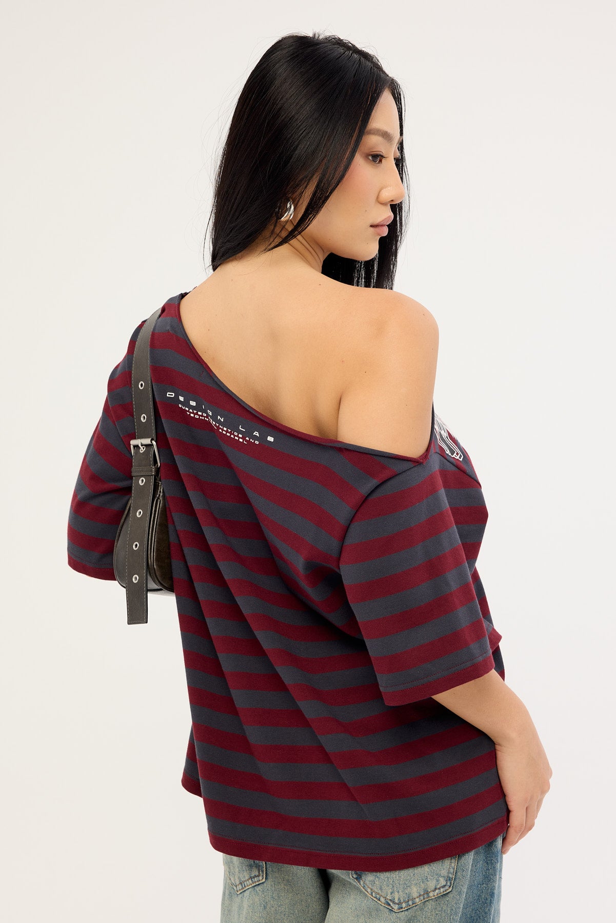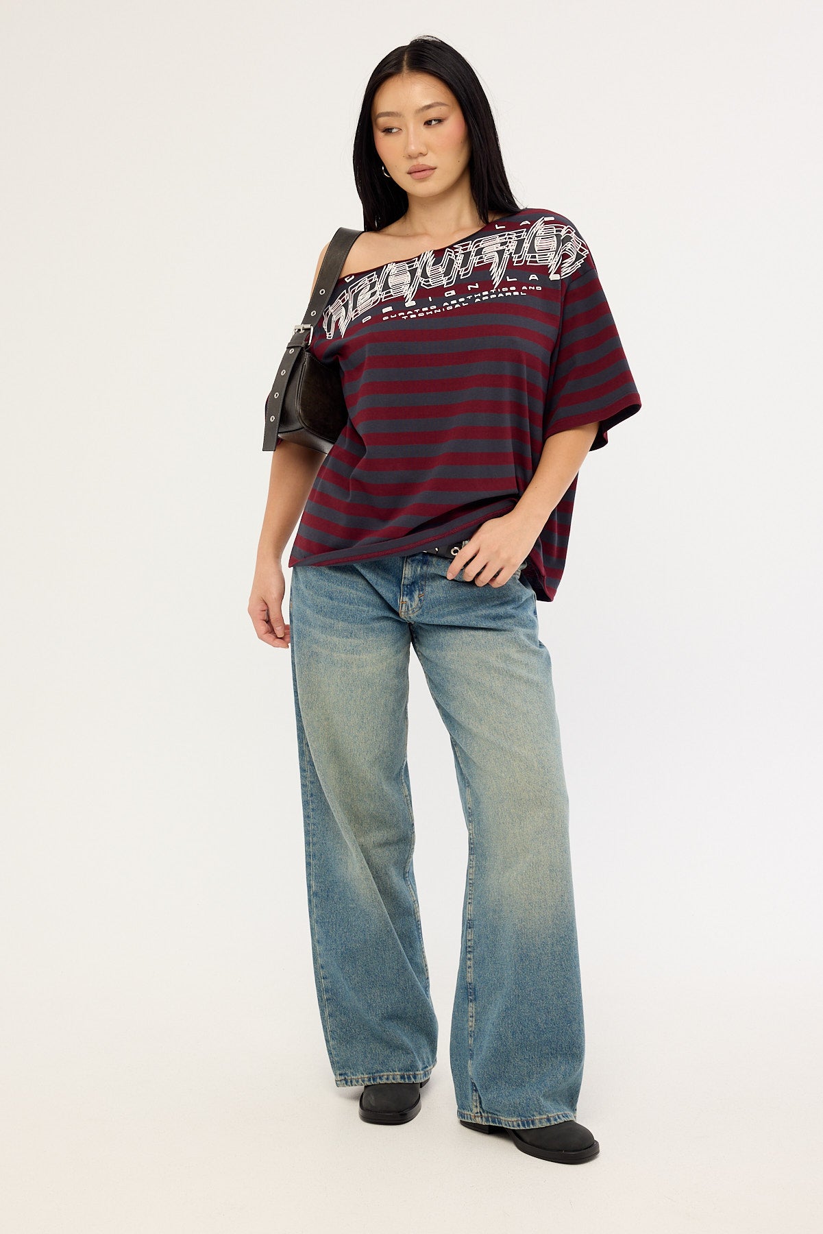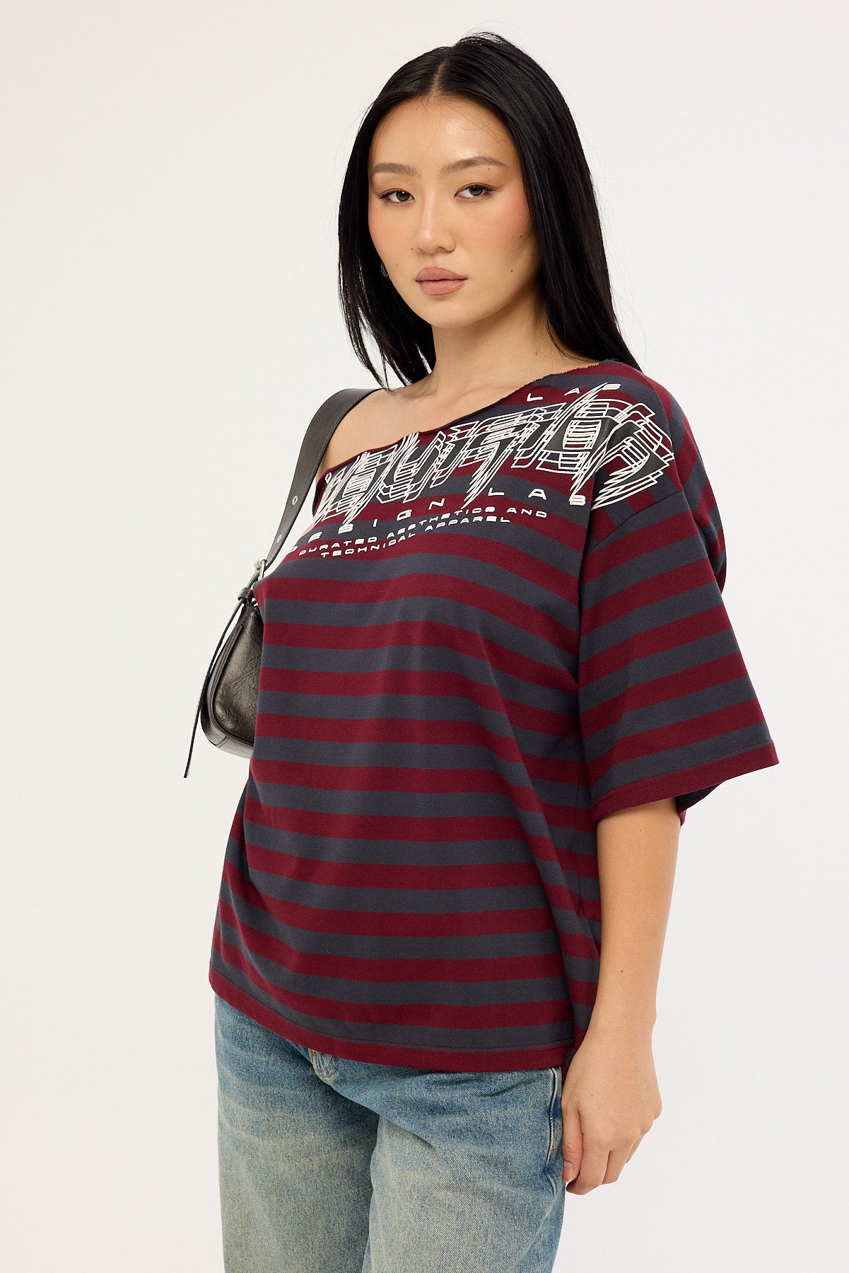Corrupt Off Shoulder Relaxed Tee Burgundy Stripe