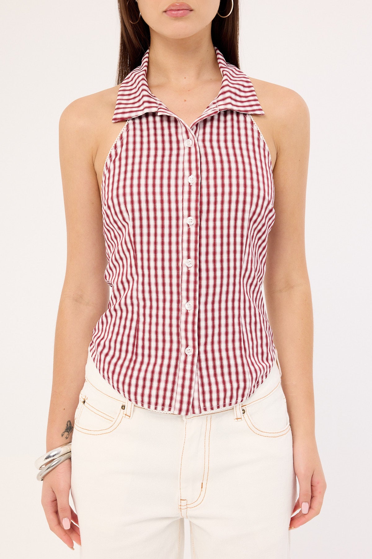 Marie Sleeveless Button Up Blouse Burgundy Check