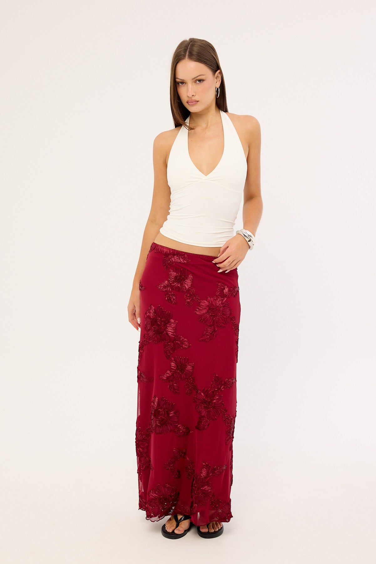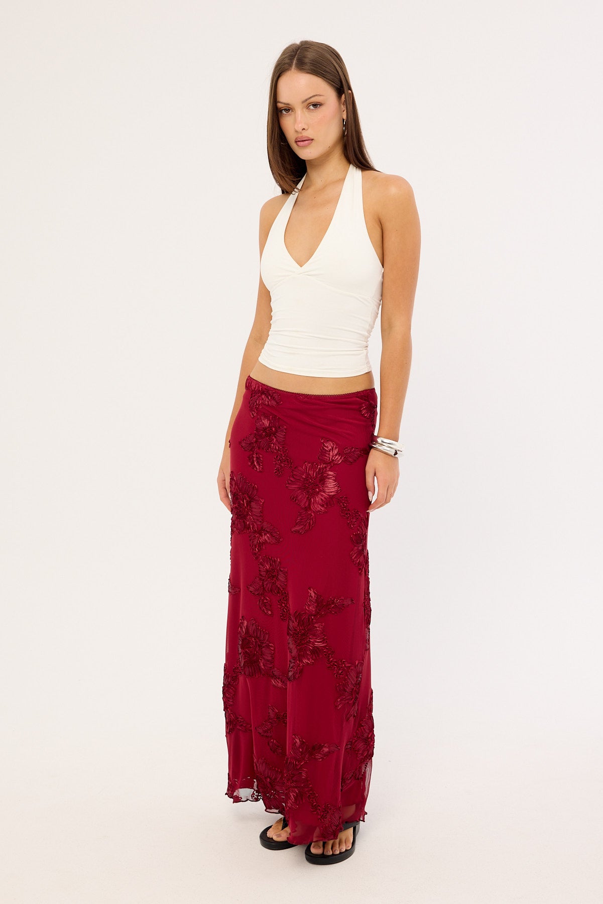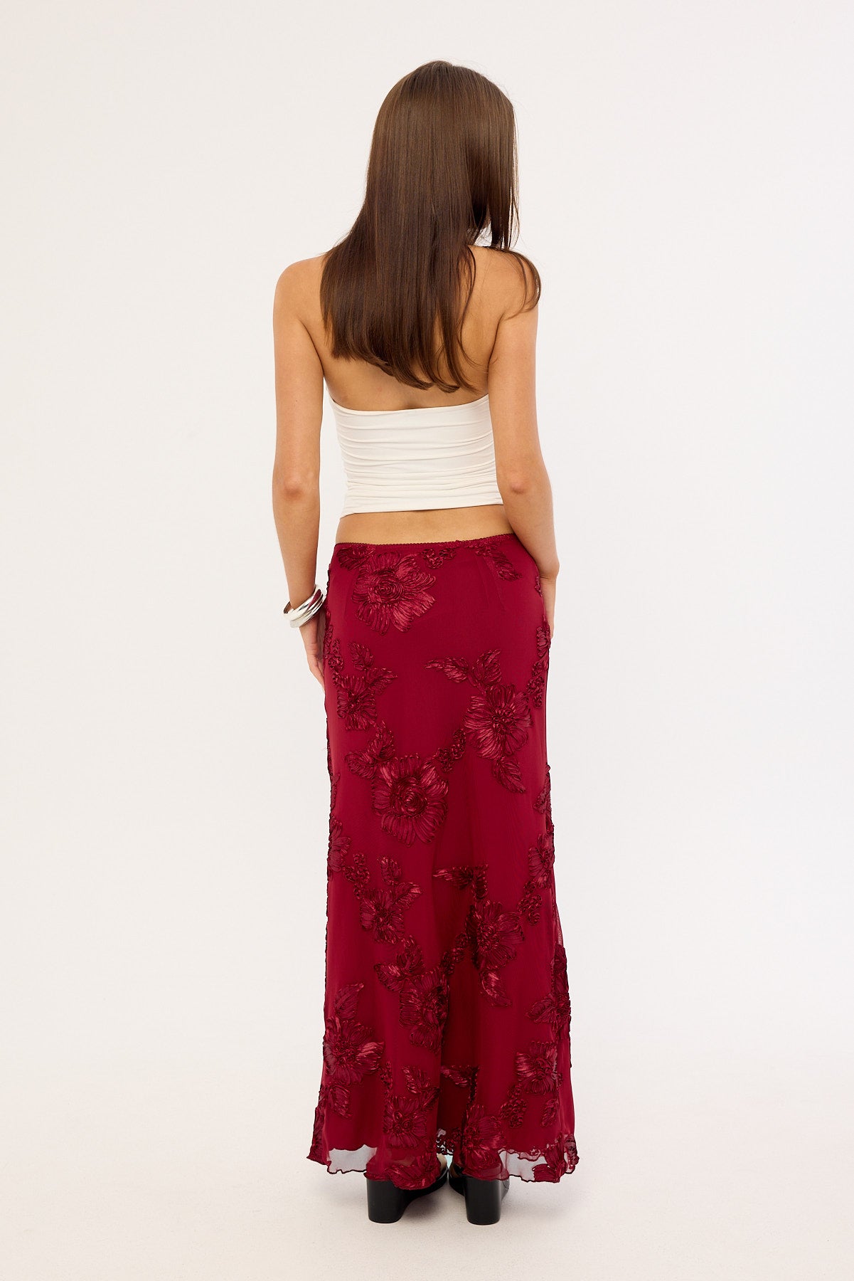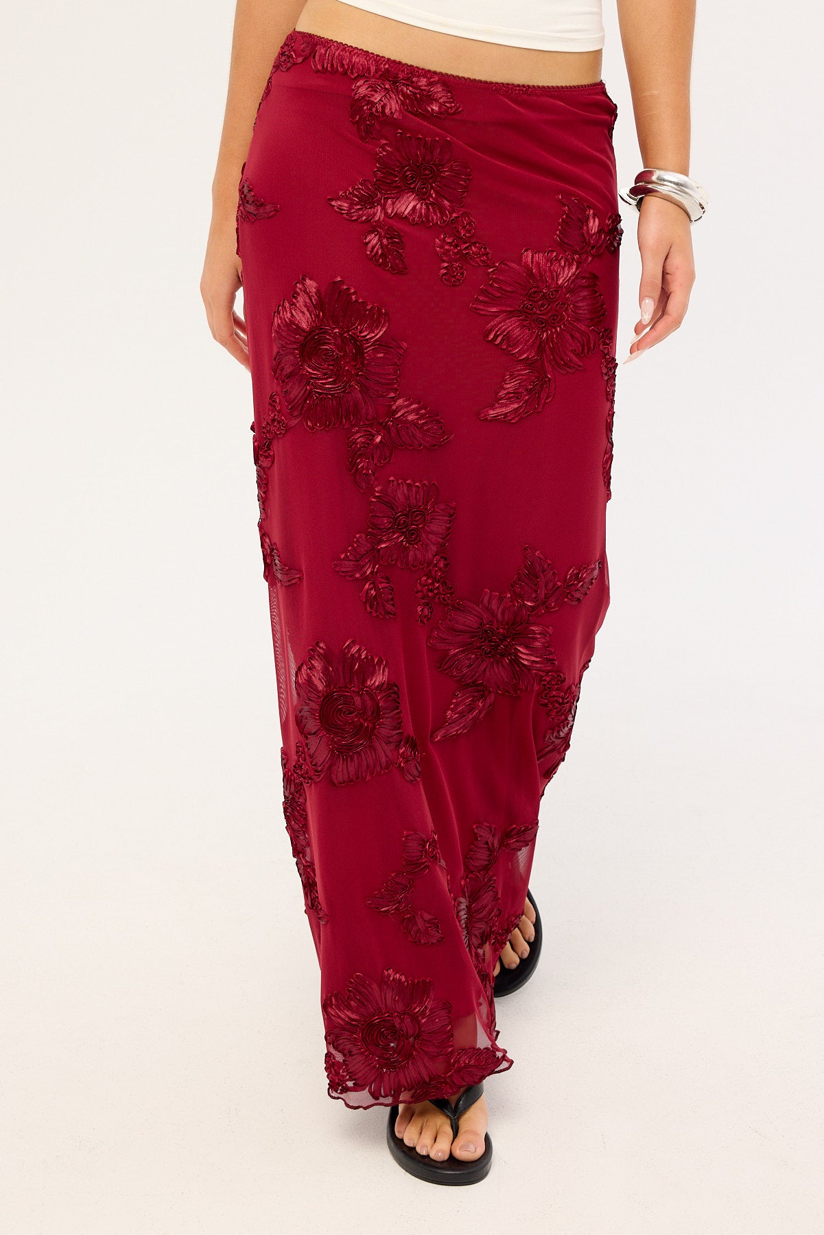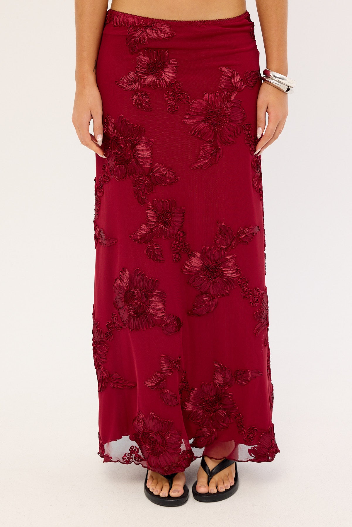 Nia Applique Mid Rise Maxi Skirt Burgundy