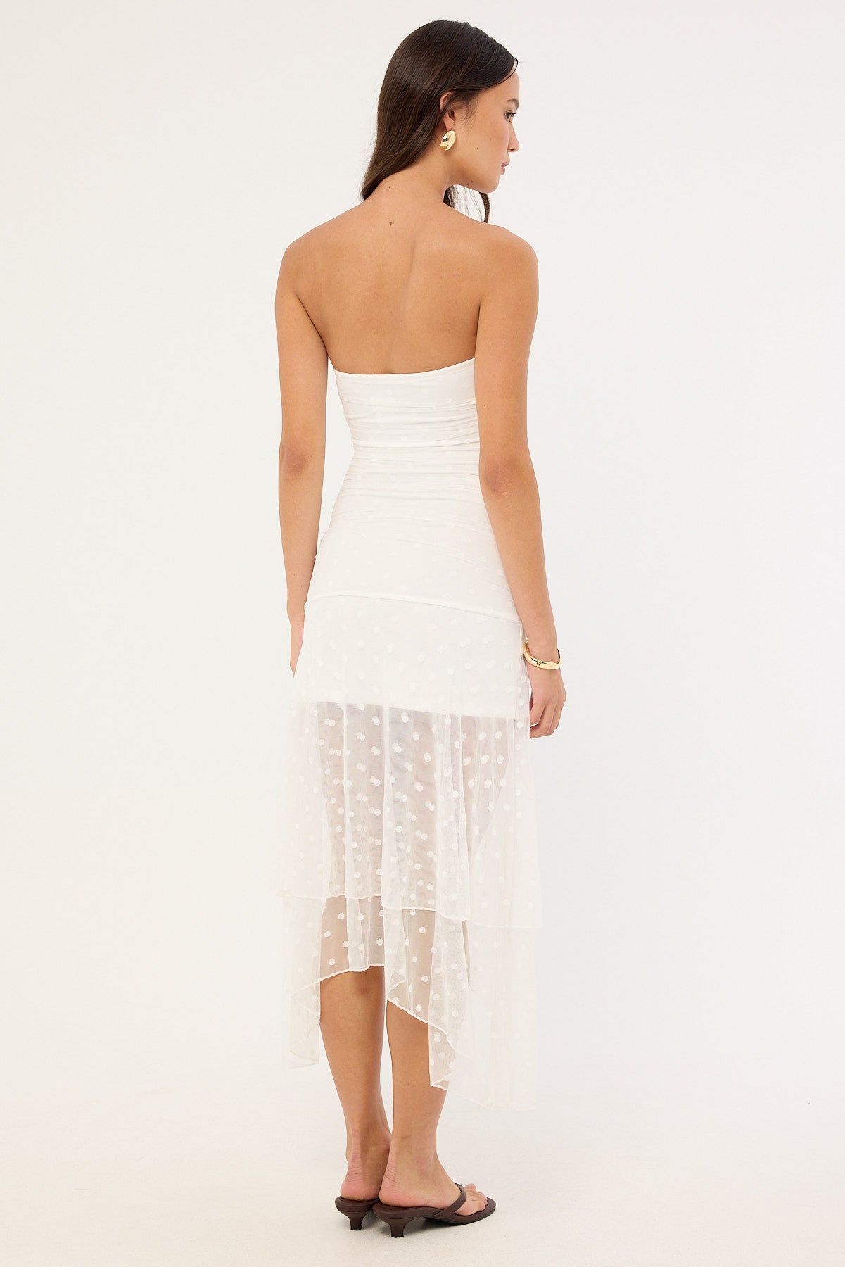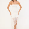 Malia Polka Strapless Asymmetrical Midi Dress White