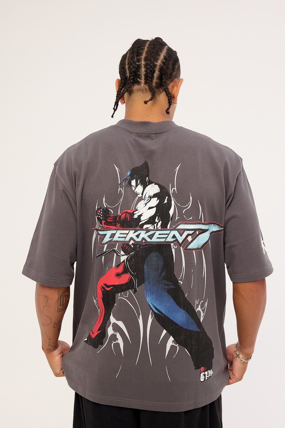 • The back artwork features a signature Neovision neo tribal artwork in reflective print, as well as a stylised artwork of the character Jin and the Tekken 7 logo. The Jin graphic and Tekken 7 logo are printed in vintage inspired cracked plastisol.